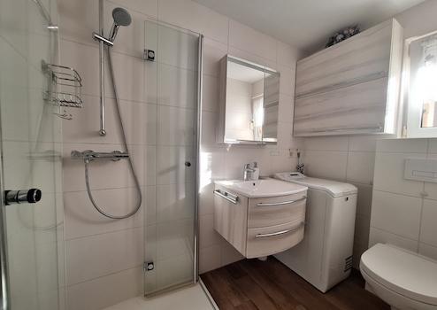 Das Schlafzimmer und das modern geflieste Duschbad gehen jeweils von der Küche ab. Das Bad wurde im Jahr 2000 komplett saniert und mit hellen großformatigen Wandfliesen ausgestattet. Als Kontrast ist der Fußboden in einem dunklen Holzton (Fliesen) gehalten. Eine Waschmaschine findet hinter dem bereits vorhandenen Waschtisch ihren Platz und für warme Füße am Morgen sorgt die Fußbodenheizung.