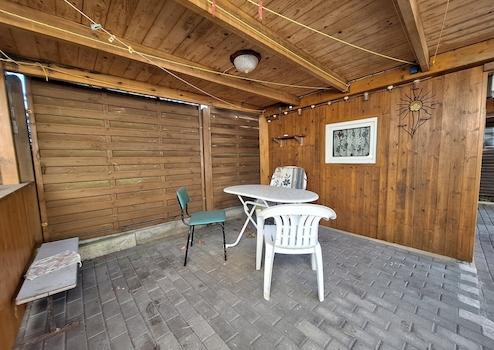 Hinter ihr verbirgt sich eine geräumige Eingangsdiele, die bereits in den sich anschließenden Wohnbereich integriert wurde. Ein Fenster zum Wohnzimmer schafft Helligkeit und Offenheit, ein maßgefertigter Einbauschrank bietet gut durchdachte Staufläche und die installierte Heizung lässt auch eine Nutzung an kalten Tagen zu.