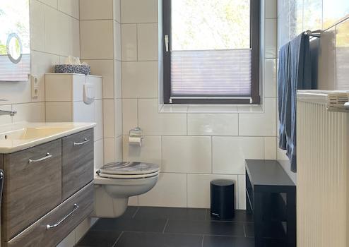 Wenn man die Diele betritt, so führt die erste Tür auf der linken Seite direkt in ein noch sehr neu wirkendes und äußerst geschmackvoll gestaltetes Badezimmer mit großem Außenfenster, das nach Norden führt.