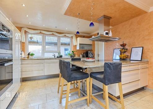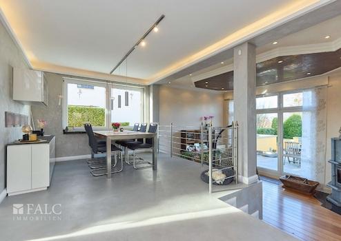 Das Besondere am Essbereich ist, dass Ihr Blick über den gesamten Wohnbereich und auch auf den Garten fällt. Gehen Sie wenige Stufen hinunter und Sie befinden sich im äußerst großzügigen Wohnbereich mit über 40 Quadratmetern Fläche. Hier ist Platz für eine ausladende Sitzgruppe sowie einen zweiten Bereich um den Kamin herum. Von hier aus gelangen Sie auch auf die Terrasse und in den Garten.