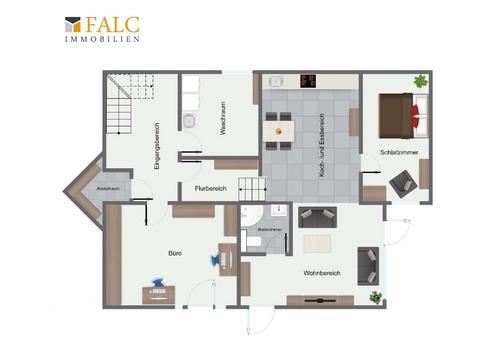 Die Einliegerwohnung ist über einen eigenen Flur begehbar und besticht mit einem Koch- und Essbereich, einem Wohnzimmer sowie einem Badezimmer und Schlafzimmer.