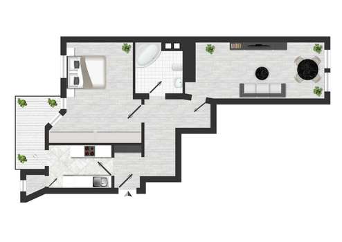 So ist das Wohnzimmer nach Süden ausgerichtet und erhält durch seine großzügige Fensterfront wohltuende Helligkeit. In der grünen Jahreszeit erfreuen hier die Bäume auch den Ausblick zur Coppistraße. Ähnliches überrascht beim Betreten des ebenso großen Schlafraums, wo die breite Fensterfront auch hier mit einem wundervollen Blick in den grünen Innenhof beeindruckt. Aufgrund des Zuschnitts des Schlafzimmers bieten sich hier gleichermaßen großzügige Einrichtungsflächen. So sind die beiden großen Wohnräume das Markenzeichen dieser Wohnung – und dies setzt sich auf dem Balkon fort, auf dem man an einer Kaffeetafel den Sommertag oder -abend genießen kann. Von der Küche aus, an die ein kleiner Abstellraum angrenzt, betritt man den Balkon.