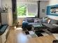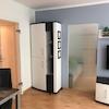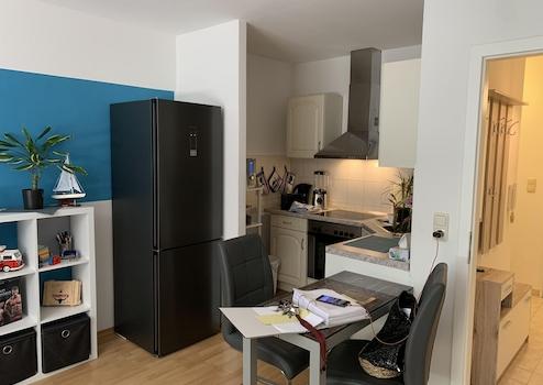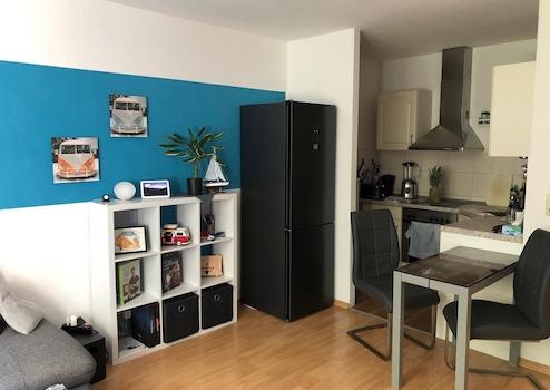 – heller Wohn- und Essbereich mit offener Küche und Designerkühlschrank