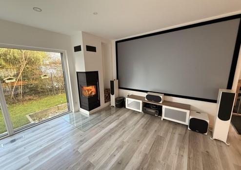 Erleben Sie Filme und Musik auf höchstem Niveau mit LED-Beamer, großformatiger Leinwand und 7.1 AV-Receiver – echtes Kinofeeling im eigenen Wohnzimmer.