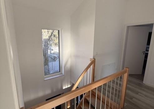 Das offene Treppenhaus mit hochwertiger Holztreppe schafft ein großzügiges Raumgefühl.