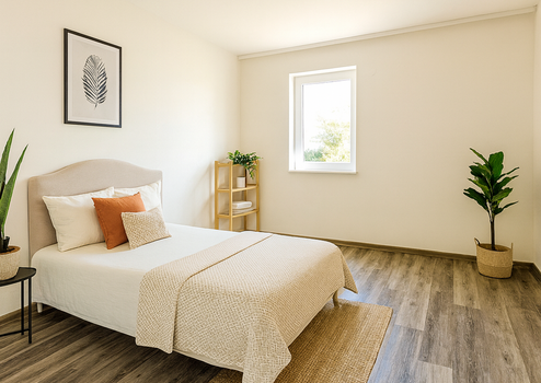 Die Wohnungen betreten Sie über den weitläufigen Flur, der ebenfalls als Essbereich genutzt werden kann. Das helle und einladende Wohnzimmer bietet viel Platz für gemütliche Abende mit Familie und Freunden. Die Fenster lassen viel Tageslicht herein und schaffen eine angenehme Atmosphäre.