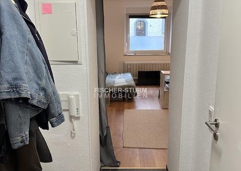 Die Wohnung liegt im Erdgeschoss eines gepflegten Mehrfamilienhauses. Ein kleiner Flur liegt mittig der Wohnung, führt links zum Wohn-Schlafraum, geradeaus ins Duschbad und rechts in die Wohnküche mit Balkon zur Rückseite. Ein Keller gehört natürlich auch zur Wohnung.