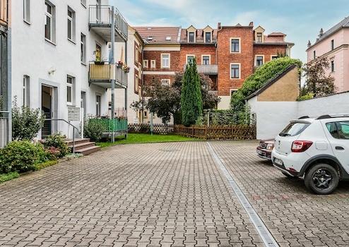 Der Innenhof ist vollständig gepflastert und mit einer Entwässerung versehen, der Müllbereich besitzt eine separate Abtrennung aus Holz mit Tor. Die Eingangstreppe ist mit haltbaren Platten aus rotem Granit belegt und die Hausbriefkastenanlage ist gut zugänglich.