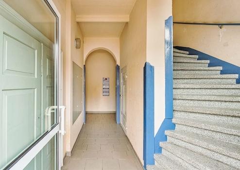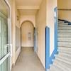 Das helle Treppenhaus ist gefliest und die Treppenstufen sind mit einem Spezial-Multicolor-Flocksystem für Fußböden beschichtet.