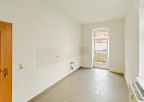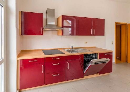 Alle Küchen haben Fenster, geflieste Fußböden, einen Fliesenspiegel und besitzen Anschlüsse für Warm- und Kaltwasser und einen Elektroherd. Eine Wohnung ist mit einer hochwertigen Einbauküche ausgestattet.