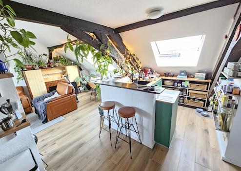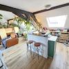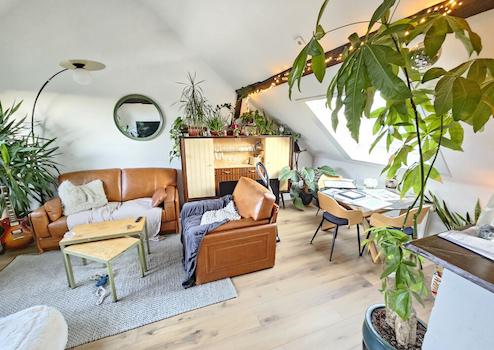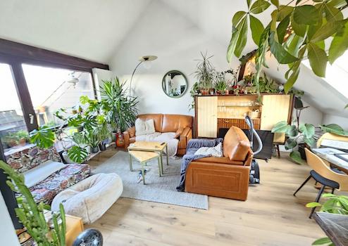 Wohnzimmer mit Ausgang zur Dachterrasse, offene Küche, Schlafzimmer, Badezimmer