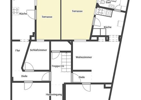 Diele, Wohnzimmer, Schlafzimmer, Küche, Badezimmer, Terrasse