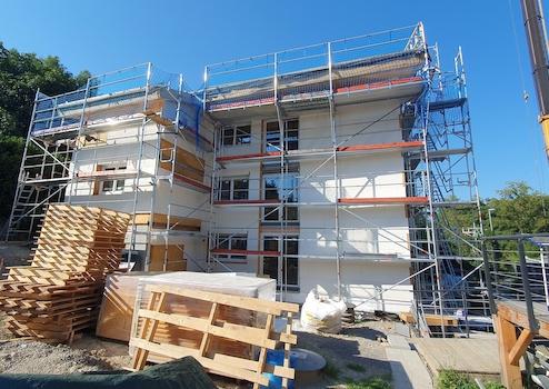 Das Gebäude ist teilunterkellert, zu jeder Wohnung gehört ein eigener Kellerraum sowie Fahrradstellplätze. Zwei Autostellplätze pro Wohnung (+30 €/Monat je Stellplatz) werden mitvermietet, später wird je ein Carport und ein Stellplatz pro Wohnung zur Verfügung stehen.