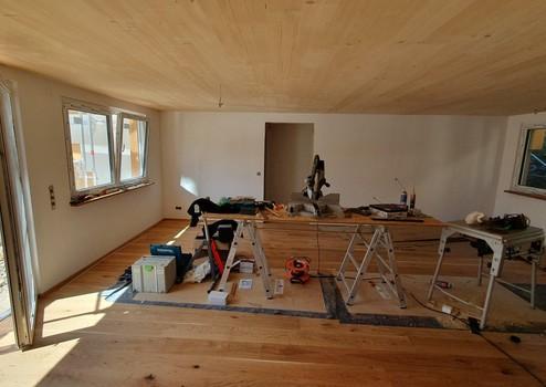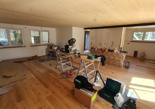 - Böden: Echtholzparkett in Wohnräumen, große Fliesen in Bädern