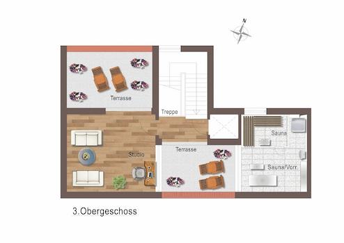 Ein ganz besonderes Highlight ist der private Wellnessbereich mit Sauna, bodengleicher Dusche und direktem Zugang zur sonnigen Dachterrasse. Ein Ort, an dem der Alltag Pause macht und Entspannung beginnt.