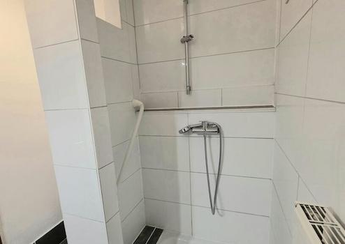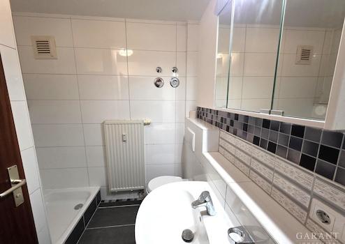 Das separate Schlafzimmer bietet ausreichend Platz für ein großes Bett sowie weitere Möbel. Das Badezimmer, zwar ohne Fenster, überzeugt dennoch mit modernen Fließen und einer praktischen Raumaufteilung.