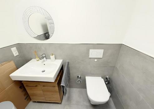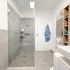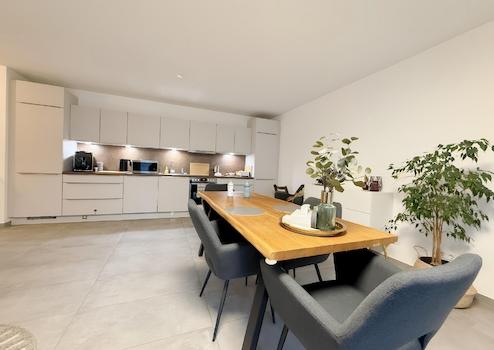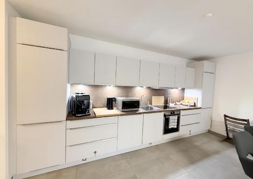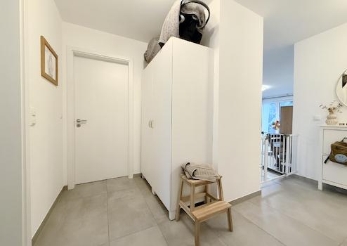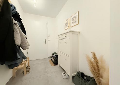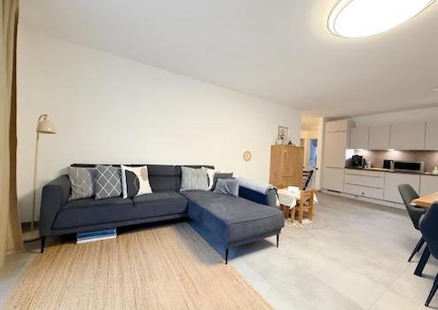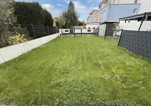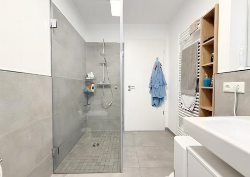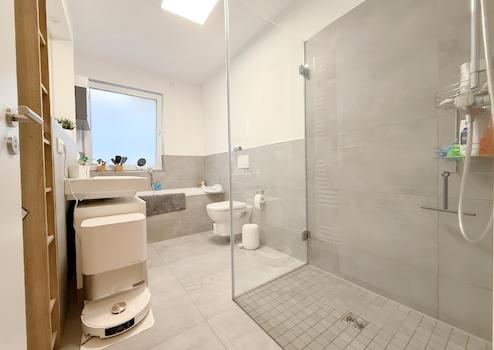 Die Wohnung bietet eine moderne, gepflegte Ausstattung: großformatige Feinsteinzeugböden, Fußbodenheizung und breite Fensterflächen für viel Licht. Das Bad ist hochwertig mit bodengleicher Dusche und Wanne, zusätzlich gibt es ein Gäste-WC. Vor Einzug werden alle Wände frisch weiß gestrichen. Draußen überzeugt eine großzügige Terrasse mit Rasenanteil. Zur Wohnung gehören außerdem eine Garage sowie ein Abstellraum im Dachgeschoss; die vorhandene Einbauküche verbleibt nicht.