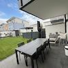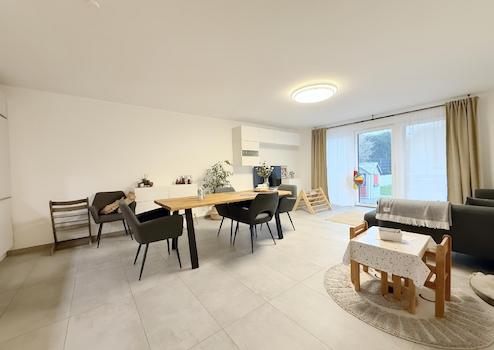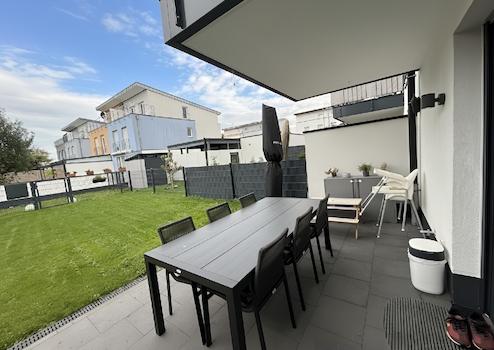 Diese moderne 3-Zimmer-Erdgeschosswohnung aus dem Baujahr 2019 überzeugt mit einem großzügigen, lichtdurchfluteten Wohn-/Essbereich mit Platz für eine offene Küche, zwei gut geschnittenen Schlafzimmern sowie einem stilvollen Bad mit bodengleicher Dusche und Wanne; ein separates Gäste-WC rundet den Grundriss ab. Große Fensterfronten, großformatige Feinsteinzeugfliesen und Fußbodenheizung schaffen ein angenehm zeitgemäßes Wohnambiente. Vom Wohnbereich geht es direkt auf die weitläufige Terrasse mit angrenzender Rasenfläche – ideal für den ersten Kaffee am Morgen oder entspannte Abende im Freien. Vor dem Einzug werden alle Wände frisch weiß gestrichen, die vorhandene Einbauküche verbleibt nicht, sodass Sie Ihre eigene Küchenplanung frei umsetzen können. Praktisch sind die zur Wohnung gehörende Garage und der zusätzliche Abstellraum im Dachgeschoss. Insgesamt präsentiert sich die Wohnung in sehr gepflegtem, nahezu neuwertigem Zustand – perfekt für Singles, Paare oder die kleine Familie, die ebenerdiges Wohnen mit hochwertigen Details und schönen Außenflächen schätzen.
