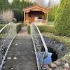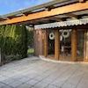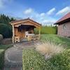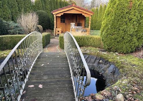 Im Garten befindet sich die überdachte Sonnenterrasse und das Blockhaus am Teich: