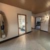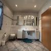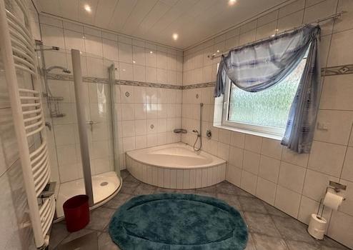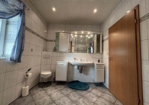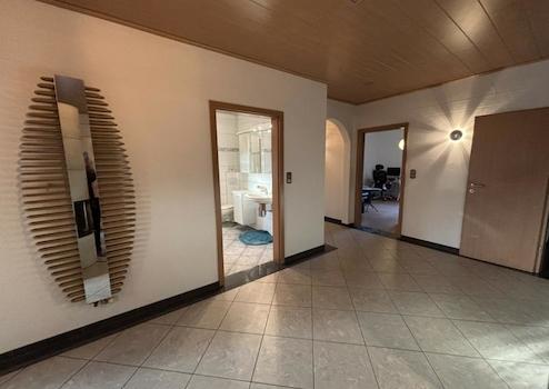 Vom Flur gelangt man in das große Badezimmer und das Gäste- WC, sowie das Schlafzimmer und den Hauswirtschaftsraum. Das zweite Badezimmer liegt hinter dem HWR und grenzt an die Werkstatt.