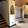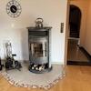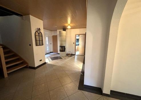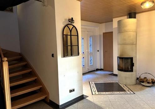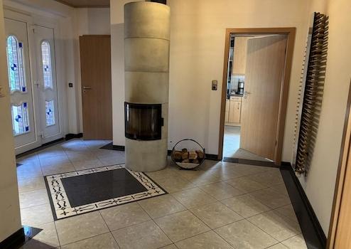 a) einen großen, hochwertigen Kaminofen im Flur: Baujahr 2023