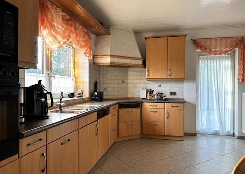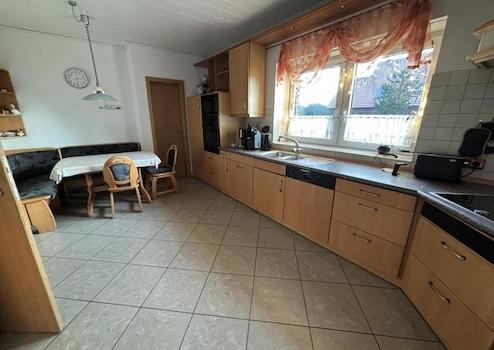 Vom Flur gelangt man links in die große Wohnküche, die mit einer hellen Einbauküche ausgestattet ist und Platz für einen Essbereich bietet.