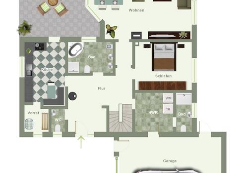 Insgesamt verfügt er über ein großes Wohnzimmer, ein Schlafzimmer, eine große Küche, eine Speisekammer, zwei Bäder, ein Gäste- WC und einen großen Hauswirtschaftsraum.