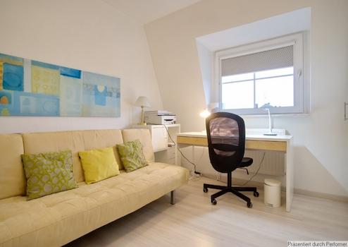 Waschmaschine und Trockner befinden sich im großen Badezimmer, ein Schreibtisch im 2. Schlafzimmer.