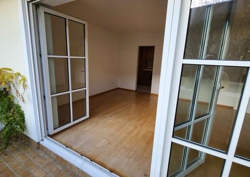 Das lichtdurchflutete Wohnzimmer ist durch die dreiflügelige, weiße Fenstertürenfront hell und freundlich !
