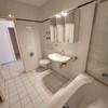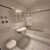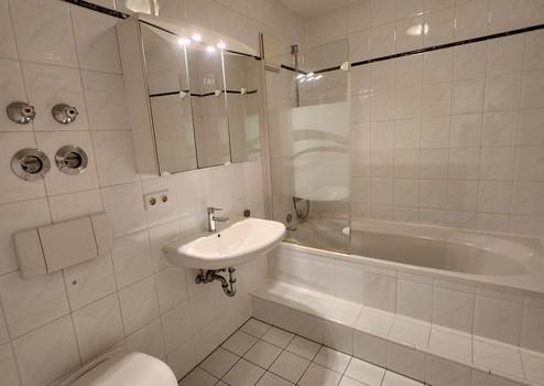 Das Badezimmer ist großzügig geschnitten, hell gefliest und mit umlaufenden Zierelementen .