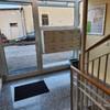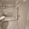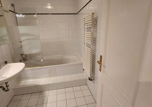 Die weiße Badewanne ist höher gesetzt und über eine Stufe lässt sie sich deshalb bequemer erreichen !