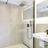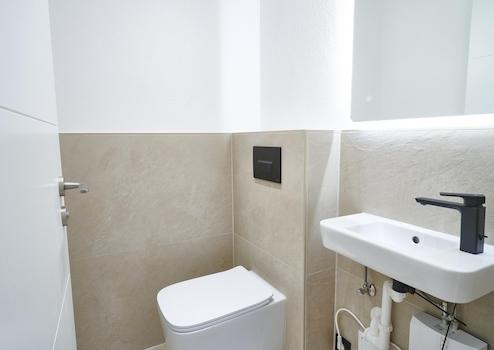 Das Badezimmer präsentiert sich als Wohlfühloase: Große, nahezu bodengleiche geflieste Dusche mit Regendusche und Badkeramik von Villeroy & Boch sowie neue Sanitärinstallationen inklusive eigener Absperrhähne und Wasserzähler.