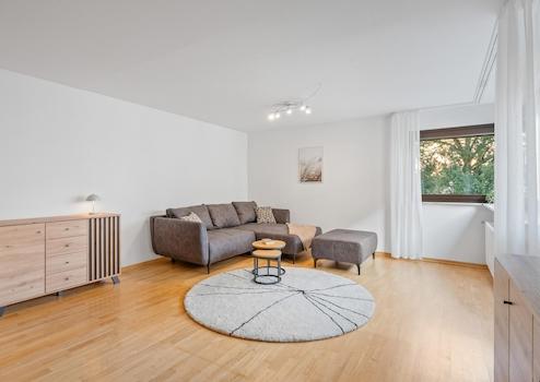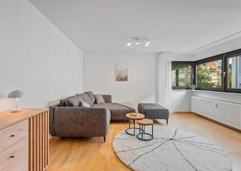 - Helles und großzügiges Wohnzimmer mit großen Fenstern und Zugang zum Balkon,