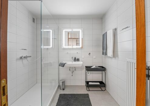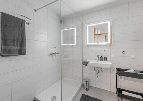 - Zeitgemäßes Badezimmer mit neuer Dusche, Wachtisch, WC und Armaturen,