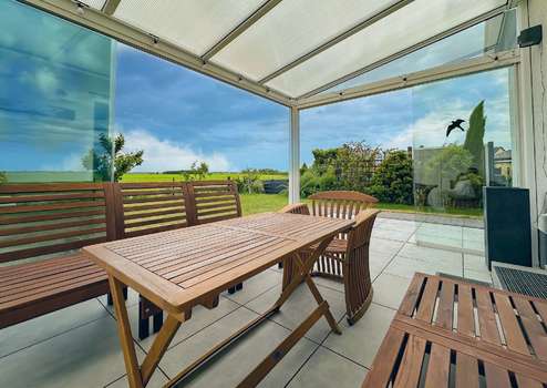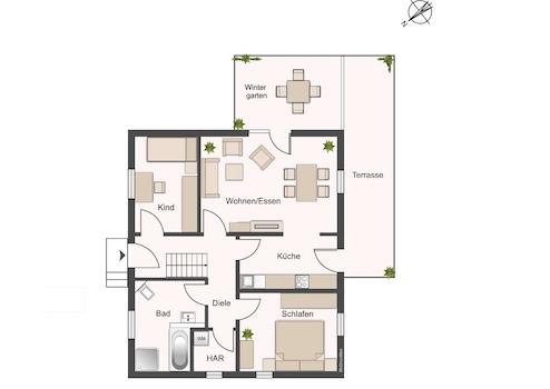 Schon beim Betreten empfängt Sie ein heller Flur, von dem alle Räume bequem erreichbar sind. Mittelpunkt dieser Etage ist das großzügige Wohnzimmer, das mit seiner direkten Verbindung zum Wintergarten besticht. Dieser lässt sich an zwei Seiten komplett öffnen und verwandelt sich so im Handumdrehen in eine weitläufige Terrasse.