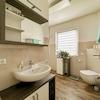 Das Tageslichtbad ist mit ebenerdiger Dusche und großer Badewanne sowie moderner Keramik ausgestattet. Ein separater Hauswirtschaftsraum sorgt zusätzlich für Ordnung und praktischen Stauraum. An heißen Tagen sichern Klimaanlagen im Wohn- und Schlafzimmer ein angenehmes Raumklima.