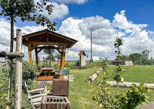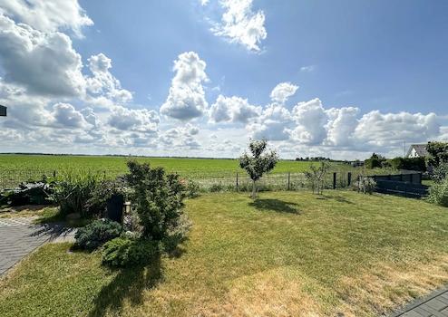Der Garten ist eine kleine Wohlfühloase. Neben einem großen Schuppen für Gartengeräte finden Sie hier eine unterirdische Regenwasserzisterne mit einem Fassungsvermögen von etwa 6.000 Litern, die die Pflege der Grünflächen erleichtert. Der Blick ins unverbaute Umland vermittelt Ruhe und Naturverbundenheit, perfekt für entspannte Stunden im Freien.