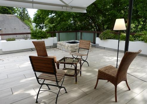 - Terrasse mit pflegeleichtem Keramikbelag in heller Holzoptik