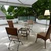 Die Terrasse misst reelle 125 qm (davon ca. 50 qm Brunnenterrasse mit Loggia, elektrischer Markise, Pflanztrögen, Eiche & Eichhorn). Gärtnerei-Tisch und Bistro-Ecke im Norden.