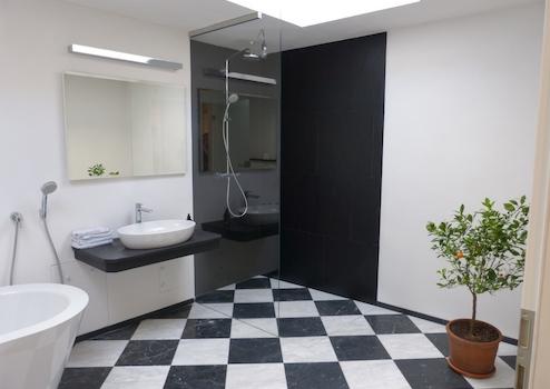 Zwei elegante Bäder (Master + Gast) mit italienischen Marmorböden und Schiefer aus dem Erzgebirge. Schwellenfreie WalkIn-Duschen und freistehende Badewanne.