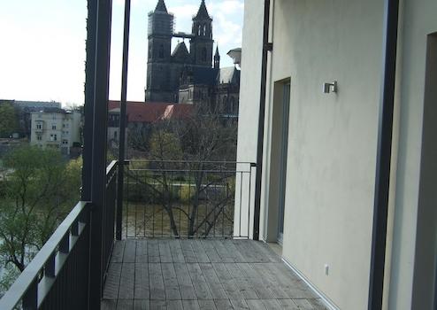 moderne Balkonfassade, direkt an der Elbe mit Blick auf