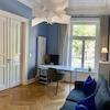 Ein Highlight sind die 3,50 m hohen Decken mit prachtvollem Stuck und Rosetten, die der Wohnung einen herrschaftlichen Eindruck verleihen. Bei sämtlicher Ausstattung wurde auf hochwertige Materialen und stilvolles Design gesetzt: Duravit-Sanitärausstattung, Zehnder Heizkörper, Bulthaup-Küche mit Granit-Arbeitsplatte, Wandfarben von Farrow&Ball und Little Greene.