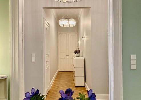 Die Wohnung zeichnet sich durch eine besonders hochwertige und stilvolle Innenausstattung aus. Zahlreiche historische Stilelemente in der gesamten Wohnung, Stuck, Fischgrätparkett aus Eichenvollholz, Hamburger Fußleisten, Holzkassetten, Fenster und Türen wurden teils komplett erneuert, teils aufgearbeitet und befinden sich in einem ausgezeichneten Zustand.