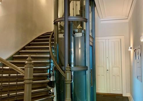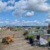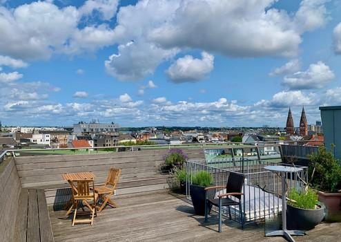 Die ca. 49 qm große gemeinschaftliche Dachterrasse ist ein weiteres Highlight und bietet einen einzigartigen 360°-Blick über Hamburg. Hierhin gelangen Sie bequem mit einem gläsernen Fahrstuhl oder über die imposante, historische Treppe.