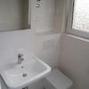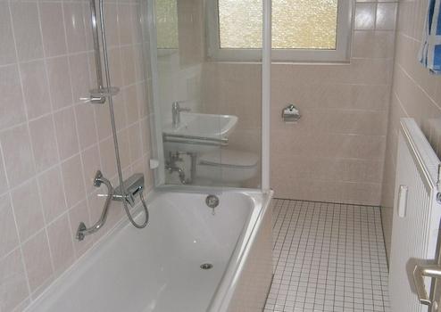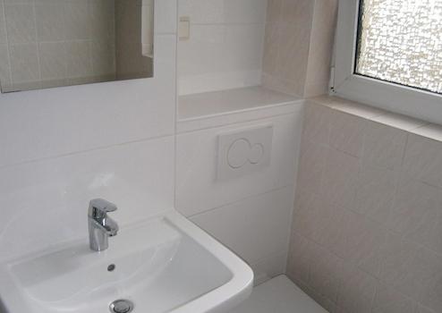 Das helle Tageslichtbad ist mit einem modernen Waschtisch, Hänge-WC und einer Badewanne ausgestattet. Eine Duschabtrennung auf der Badewanne sorgt für zusätzlichen Komfort.
