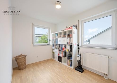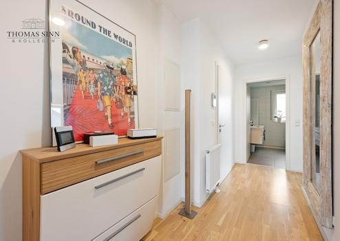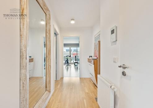 Von der Tiefgarage gelangen Sie bequem mittels Aufzugs direkt vor die Wohnung im 3. OG (DG). Der Eingangsbereich bietet Platz für Ihre Garderobe. Linker Hand befindet sich das hochwertige Badezimmer mit bodengleicher Dusche und Doppelwaschtisch. Anschließend ist das Kinder- und das Schlafzimmer. Das Kinderzimmer bietet sich auch idealerweise für Ihr Home-Office an.