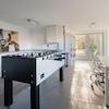 Der Eingangsbereich empfängt Sie großzügig und offen. Eine geschwungene Treppe aus Holz und Metall führt ins Obergeschoss und prägt das Raumgefühl. Von hier gelangen Sie in die moderne Küche mit Edelstahlfronten und in den angrenzenden Essbereich, der fließend in das helle Wohnzimmer übergeht. Hier sorgt ein drehbarer Designerkamin aus Edelstahl für eine stilvolle Atmosphäre.