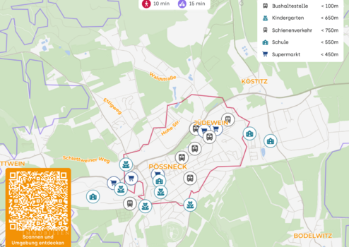 Das Haus liegt in zentraler und zugleich angenehm wohnlicher Lage von Pößneck – ideal für eine junge Familie, die kurze Wege liebt und dennoch ein ruhiges Zuhause sucht. Der Marktplatz im Stadtzentrum ist in etwa 5 bis 7 Minuten zu Fuß erreichbar – perfekt für den schnellen Einkauf, den Wochenmarkt oder ein Eis am Nachmittag. Und wenn es einmal zügig gehen soll: Die Bushaltestelle befindet sich nur rund 40 Meter entfernt. So bleibt im Familienalltag mehr Zeit für das, was wirklich zählt.