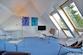 Auf der Galerie befindet sich ein großer, offener Raum mit großen Dachflächenfenstern und einem Velux-Dachbalkon, so dass es hier auch im Sommer sehr luftig ist. Neben dem HomeOffice-Bereich mit Schreibtisch und Stuhl bietet eine weitere Sitzecke mit Sofa und zwei Korbsesseln die Möglichkeit, Kabel-TV zu schauen.