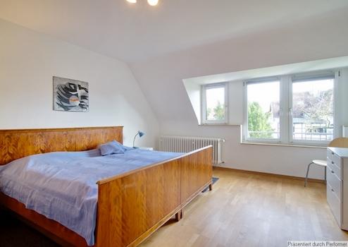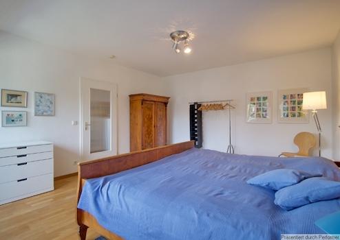 Das große Schlafzimmer bietet einen grandiosen Blick in die Gärten und auf den Grafenberger Wald. Es ist ausgestattet mit einem antiken Nussbaum-Bett (2 x 2 Meter), zwei Nachttischen, Kommode, 2-türigem Kleiderschrank und zusätzlichem Konfektionsständer, es ist ruhig nach hinten raus gelegen.